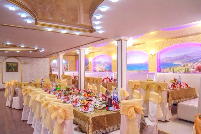 Интерьер залов выполнен в современном, торжественном стиле и не требует дополнительного оформления. В ресторане возможно провести, как пышное торжество, так и небольшое семейное мероприятие.
